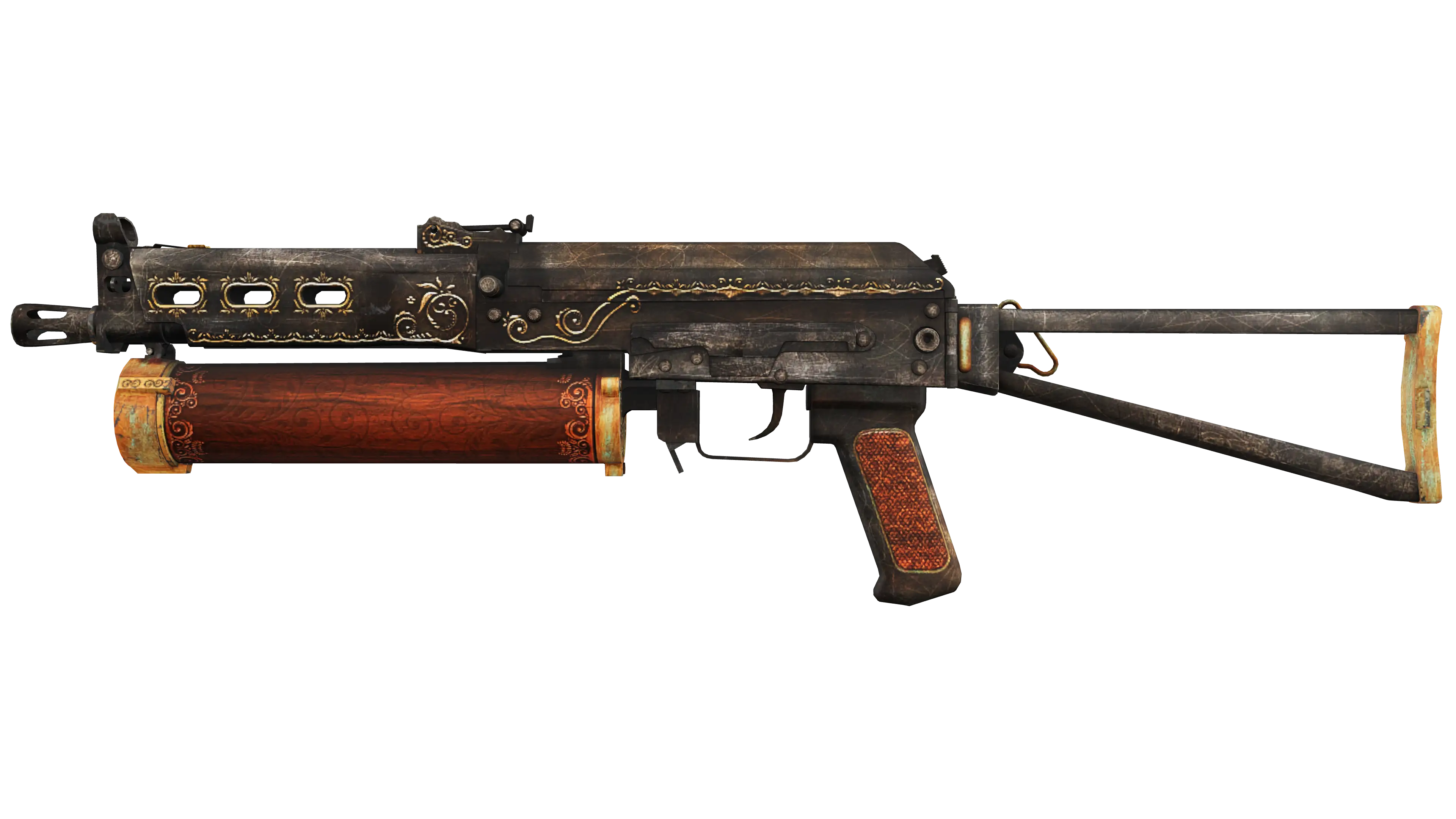 The Bizon SMG is low-damage, but offers a uniquely designed high-capacity drum magazine that reloads quickly