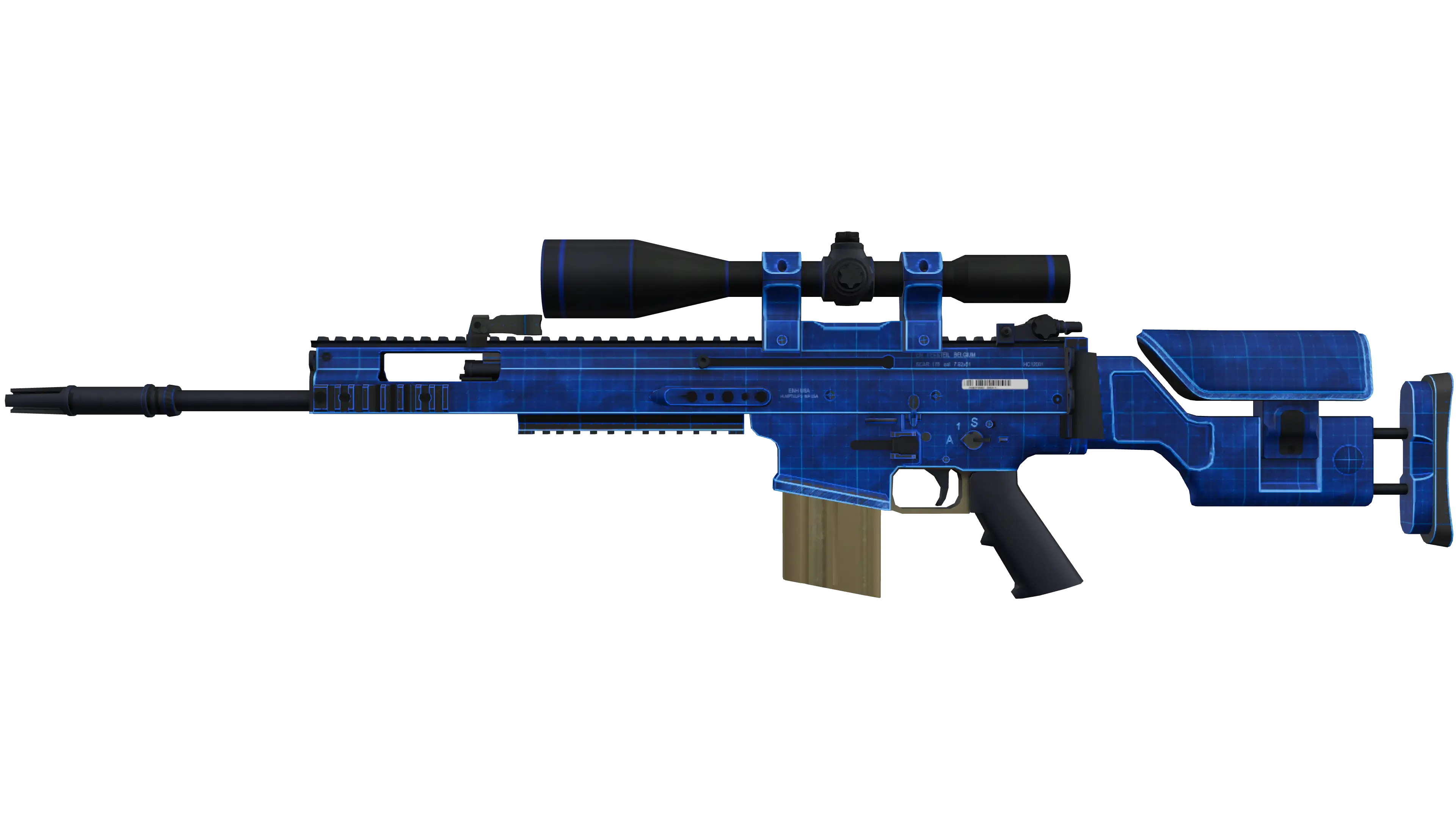 The SCAR-20 is a semi-automatic sniper rifle that trades a high rate of fire and powerful long-distance damage for sluggish movement speed and big price tag